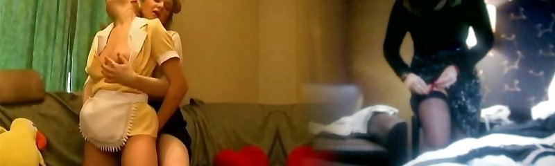 Sumptuous maid in uniform and horny domme are making love in the kitchen