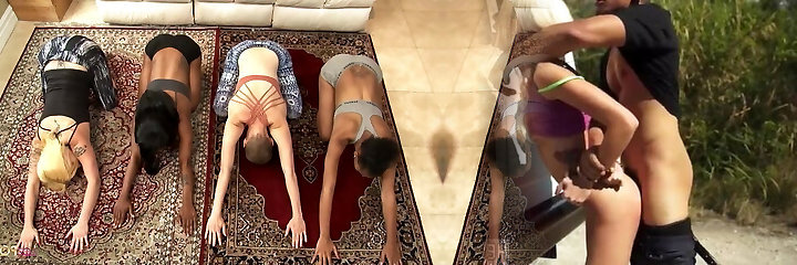 Four girls are exercising in the living bedroom and when they get sweat-soaked the lesbian masturbation starts