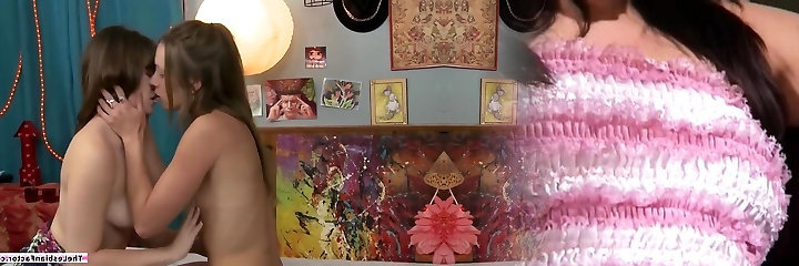 Skinny brunette college girl with puny bosoms and big nipples is pleased by her busty lesbian girlfriend