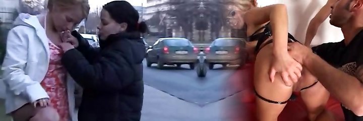 Two sexy girls fondle each others vags in the street